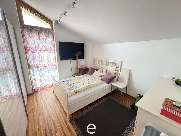 Ein zusätzlicher Raum eignet sich ideal als Homeoffice oder Gästezimmer. Ergänzt wird diese Ebene durch ein Gäste-WC, einen Hauswirtschaftsraum sowie einen praktischen Abstellraum. Großzügige Fensterflächen sind mit elektrischen Raffstores ausgestattet und sorgen für komfortablen Sonnen- und Sichtschutz bei optimalem Lichteinfall