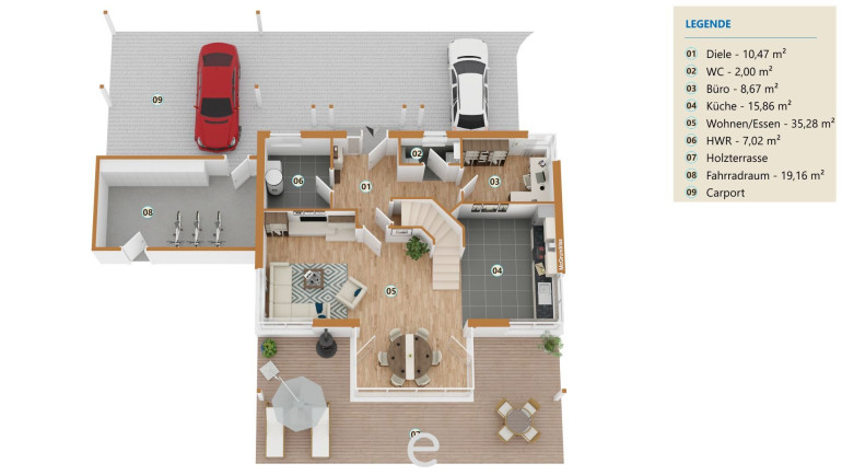Für Fahrzeuge steht ein Doppelcarport mit angrenzendem Fahrrad- und Abstellraum mit ca. 19 m² zur Verfügung. Ergänzt wird das Angebot durch einen zusätzlichen Stellplatz direkt vor dem Haus, der den hohen Alltagskomfort dieses Anwesens abrundet.