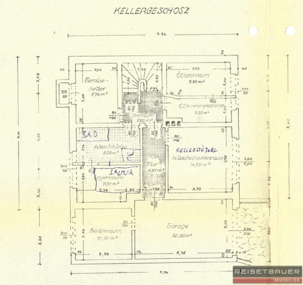 Untergeschoss: ca. 63 m² mit Sauna und weiteren Räumen, plus ein Geräteraum (ca. 10 m²) und eine Garage (ca. 20 m²).