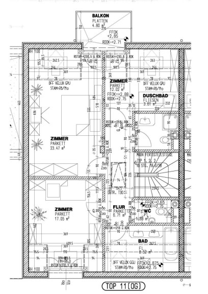 Der Stiegenaufgang führt in das Obergeschoss in dem sich 2 Zimmer, eines davon mit begehbarer Garderobe, mit Ausgang auf den ca. 5m² großen Balkon befinden sowie ein weiteres Zimmer, ein Duschbad und ein großes Bad mit Wanne, Doppelwaschtisch, Waschmaschinenanschluß und ein separates WC.