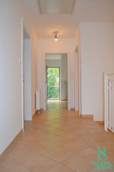 Der Stiegenaufgang führt in das Obergeschoss in dem sich 2 Zimmer, eines davon mit begehbarer Garderobe, mit Ausgang auf den ca. 5m² großen Balkon befinden sowie ein weiteres Zimmer, ein Duschbad und ein großes Bad mit Wanne, Doppelwaschtisch, Waschmaschinenanschluß und ein separates WC.