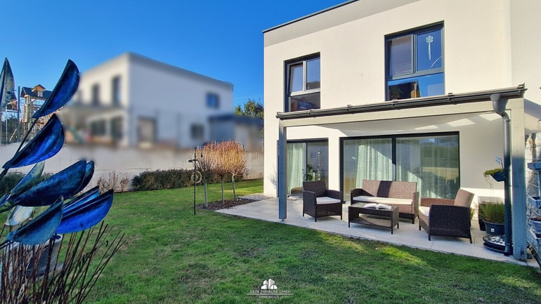 Die Fahrzeuge (2 Stellplätze) stehen bequem direkt vor dem Haus. Vom Wohnzimmer gelangen Sie direkt auf die überdachte Terrasse und genießen den kleinen, feinen Eigengarten.