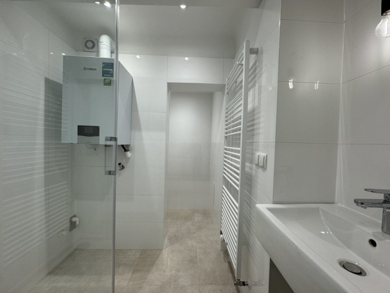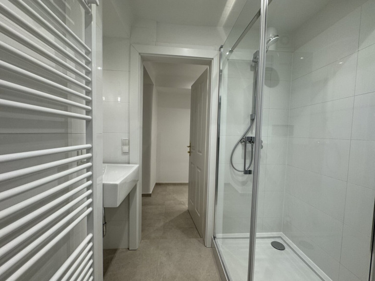 - Neues Bad mit Dusche, Waschbecken, Handtuchheizkörper und WM-Anschluss