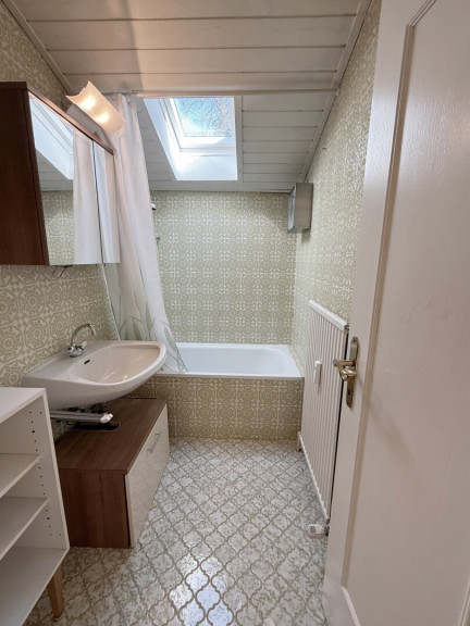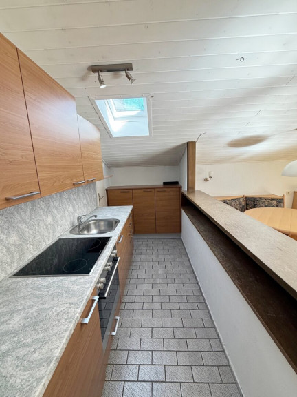 Die separate Küche ist funktional ausgestattet und verfügt über eine praktische Küchenzeile mit ausreichend Arbeitsfläche und Stauraum. Auch hier sorgt ein Dachflächenfenster für angenehmes Tageslicht. Das Badezimmer ist mit einer Badewanne sowie einem Waschbecken ausgestattet und wird ebenfalls natürlich belichtet.