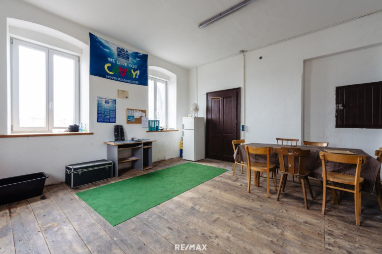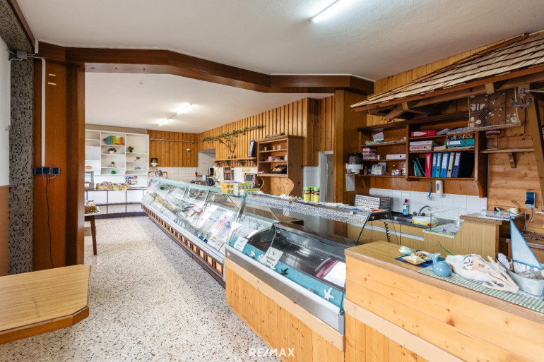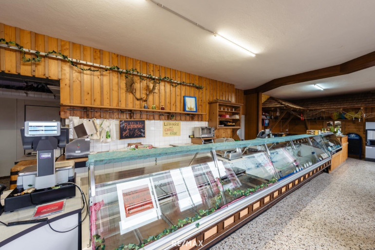 Der neuere Gebäudeteil ist bereits für den Lebensmittelbereich eingerichtet: Er verfügt über einen Verkaufsraum mit Kühlvitrine, Kühl- und Trockenlager, eine Betriebs- bzw. Produktionsküche und separate Verarbeitungsräume – inklusive vorhandener Schlachtzulassung.