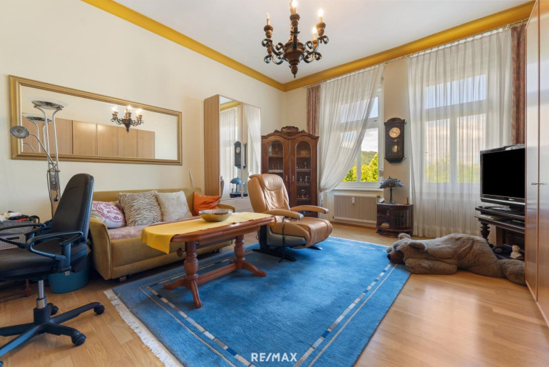 Der südlich ausgerichtete, besonders großzügige Salon schafft ein exklusives Ambiente. Direkt angrenzend befindet sich das ca. 44 m² große Wohnzimmer, ebenfalls südseitig gelegen. Drei weitere Zimmer, eines davon mit begehbarer Garderobe, bieten vielfältige Nutzungsmöglichkeiten. Eine Küche mit Essbereich, ein Tageslichtbad mit offener Dusche sowie ein separates WC vervollständigen das stimmige Raumkonzept.