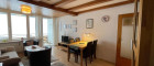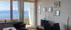 Der ca. 18 m² große Wohn-/Essbereich ist über die ganze Breite des Zimmers nach Süden hin verglast, mit direktem Zugang zur Loggia. Das Wohnzimmer ist ausgestattet mit einer Vitrine für Gläser, einem Einbauschrank und einer Schlafcouch mit gemütlicher Sitzecke, einem Smart-TV mit Kabelanschluss und einer neuen Minianlage mit DAB-Radio.