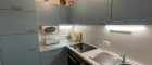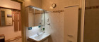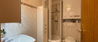 Im Badezimmer finden Sie einen Spiegelschrank mit LED-Beleuchtung und ein Waschbecken samt Unterschrank mit Kleinteilauszug und großem Schubfach. Für Handtücher und Kosmetik ist noch ein zusätzlicher Schrank vorhanden. Die Möbel sind in Weiß Hochglanz ausgeführt. Im Bad ist auch der Boiler zur dezentralen Warmwasseraufbereitung untergebracht, ebenso wie Dusche und Toilette.