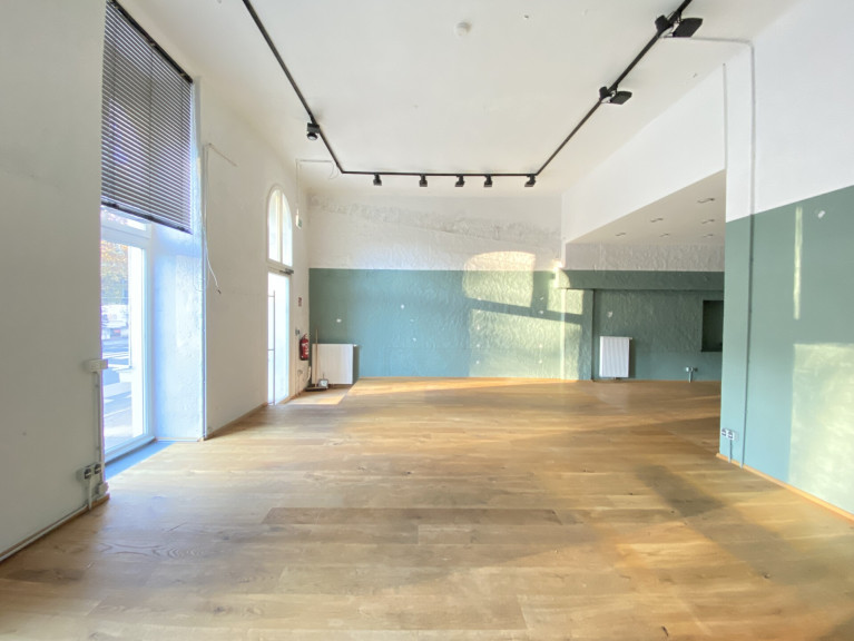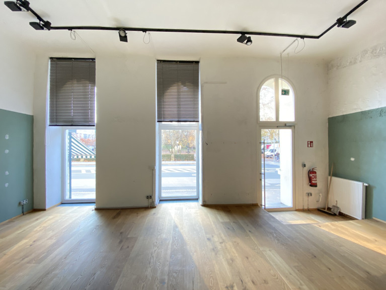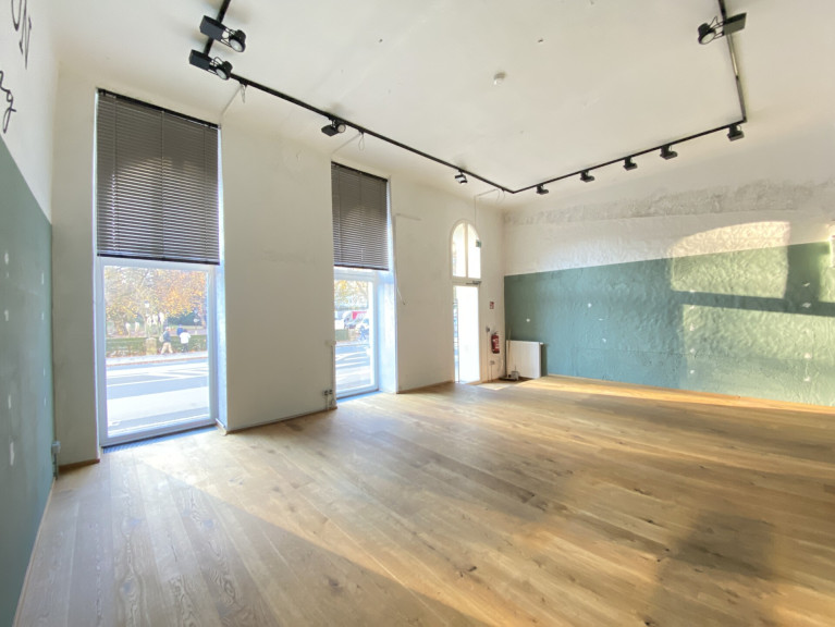 Der straßenseitige Verkaufsbereich weist eine hohe Raumhöhe aus und ist dank der großen Fenster ausgesprochen hell und freundlich.