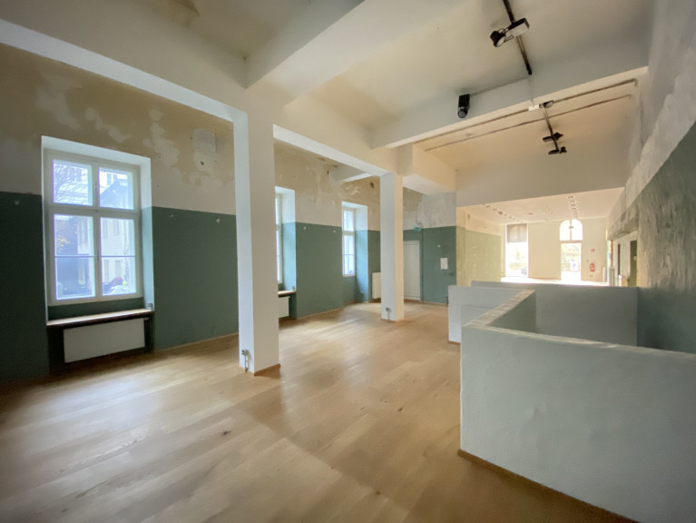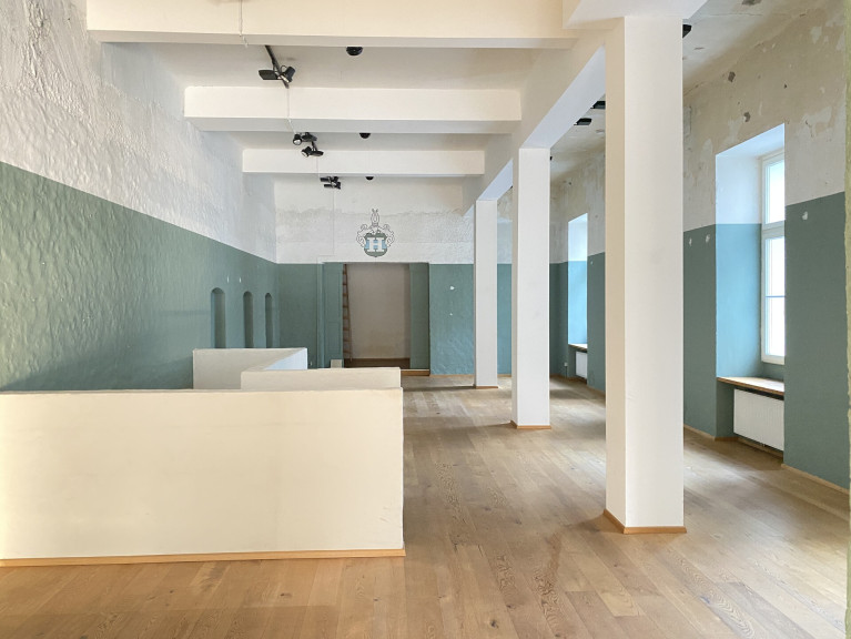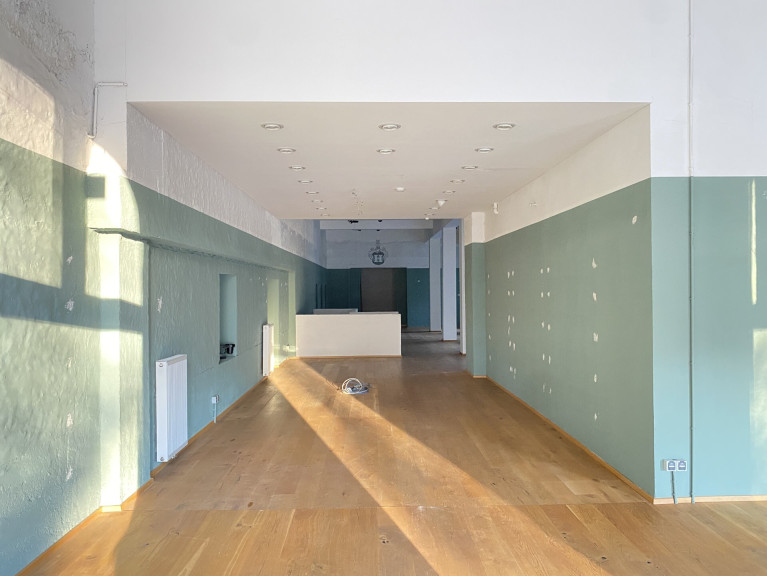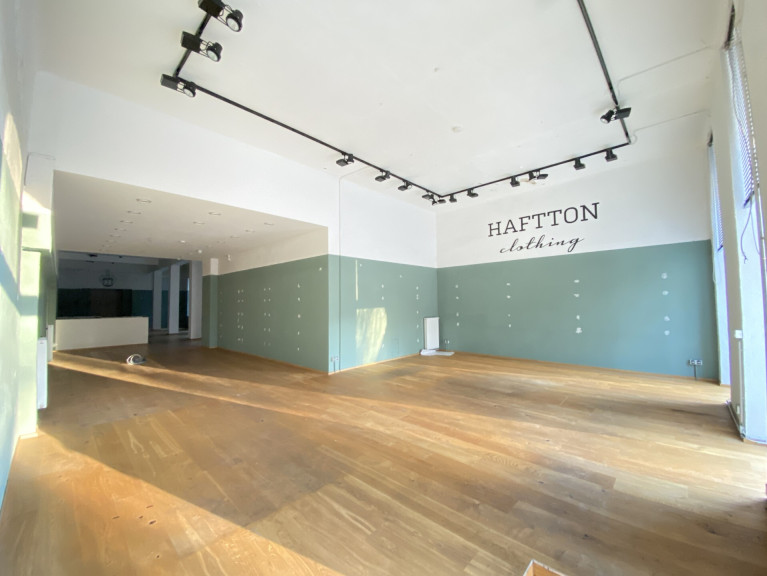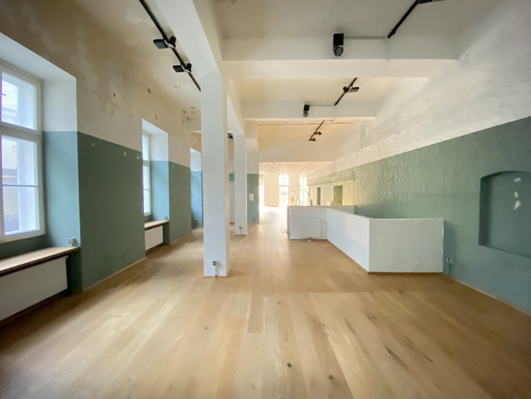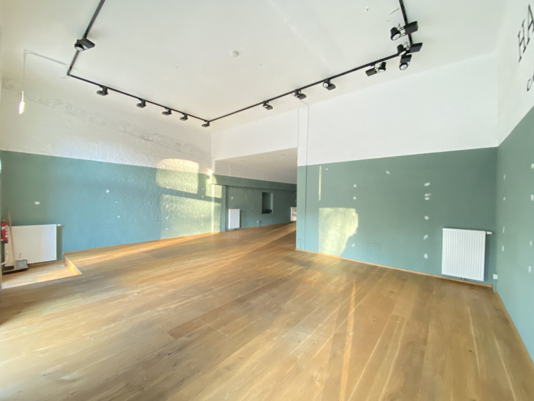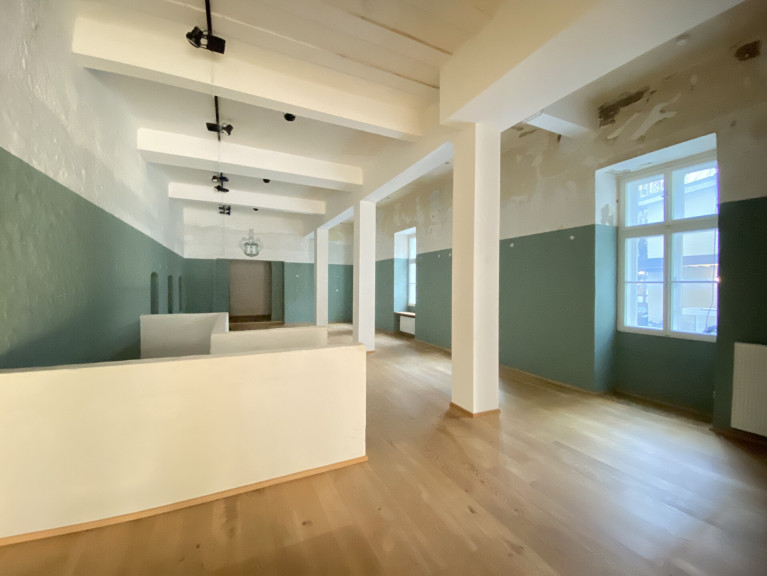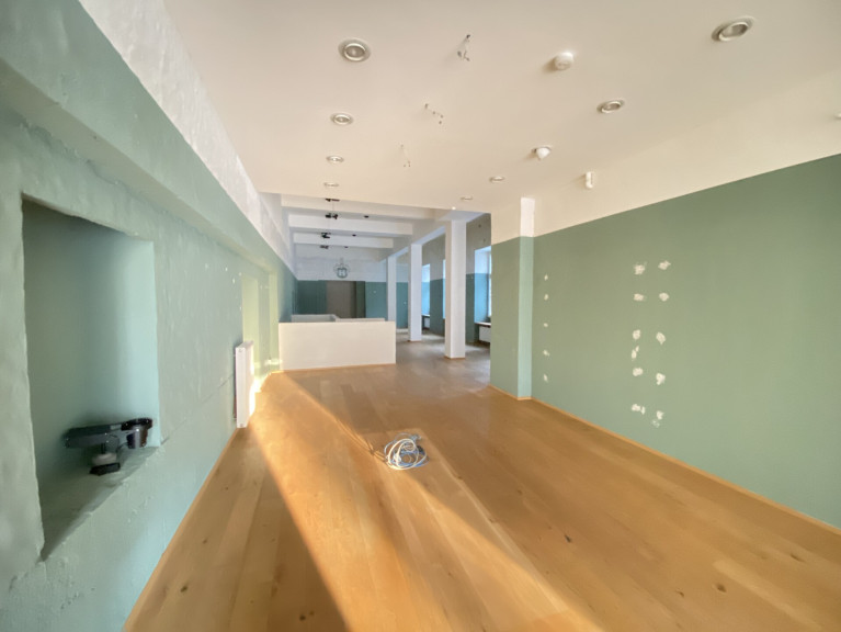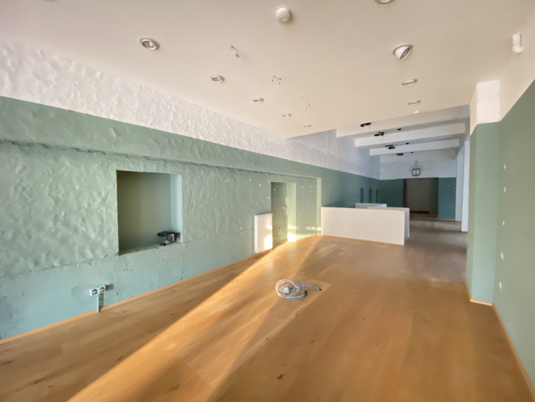 Im hinteren Bereich erstreckt sich ein weiterer Verkaufsraum ins Gebäudeinnere, mit Fenstern an der Ostseite. Der Abgang zum Keller wird laut Angaben des Eigentümers noch verschlossen, der Keller ist nicht Teil der Mietfläche.