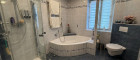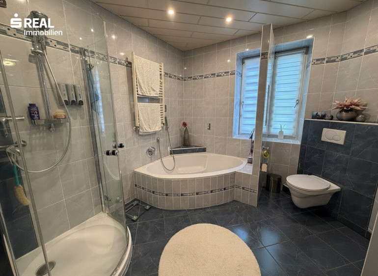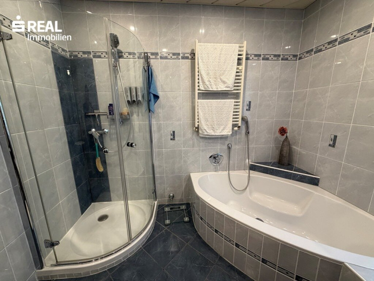 - Badezimmer mit Eckbadewanne und separater Dusche
