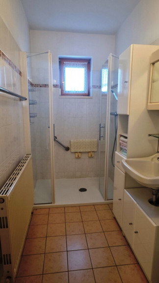 Die Wohneinheit im Erdgeschoß verfügt über einen Vorraum, eine Küche mit Speis, ein Wohnzimmer, zwei Schlafzimmer, ein Badezimmer mit bodenebener Dusche sowie ein separates WC.
