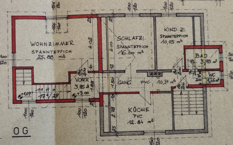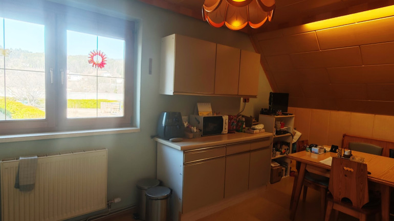 Im Obergeschoß befinden sich eine weitere Küche, ein Wohnzimmer, zwei Schlafzimmer, ein Badezimmer mit Dusche und Badewanne sowie ein separates WC. Sowohl Bad als auch WC verfügen über Fenster.