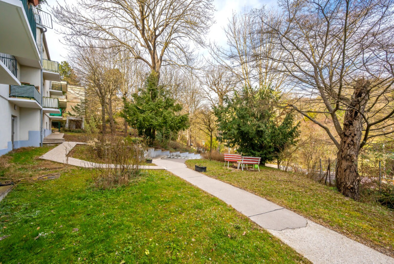 Die Wohnung befindet sich in der Bujattigasse, 1140 Wien, und bietet eine idyllische, ruhige Umgebung, einschließlich eines kleinen Baches und viel Grün direkt vor der Haustür.