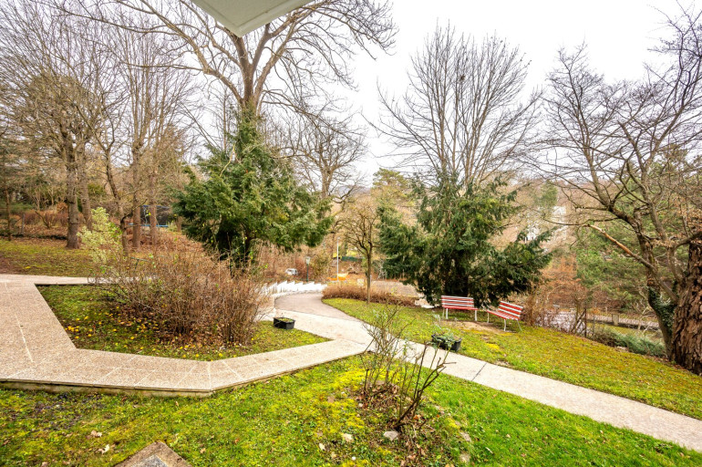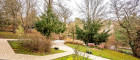 The apartment is located in Bujattigasse, 1140 Vienna, a tranquil and green area known for its idyllic surroundings, including a nearby stream and lush greenery.