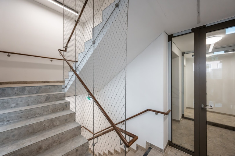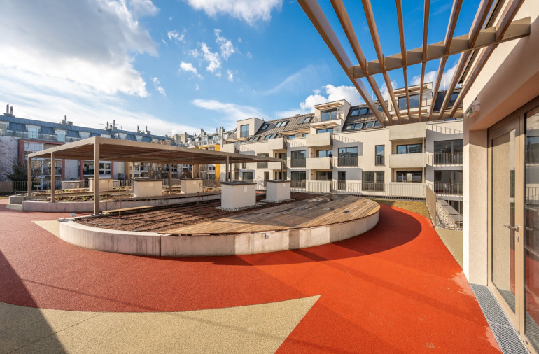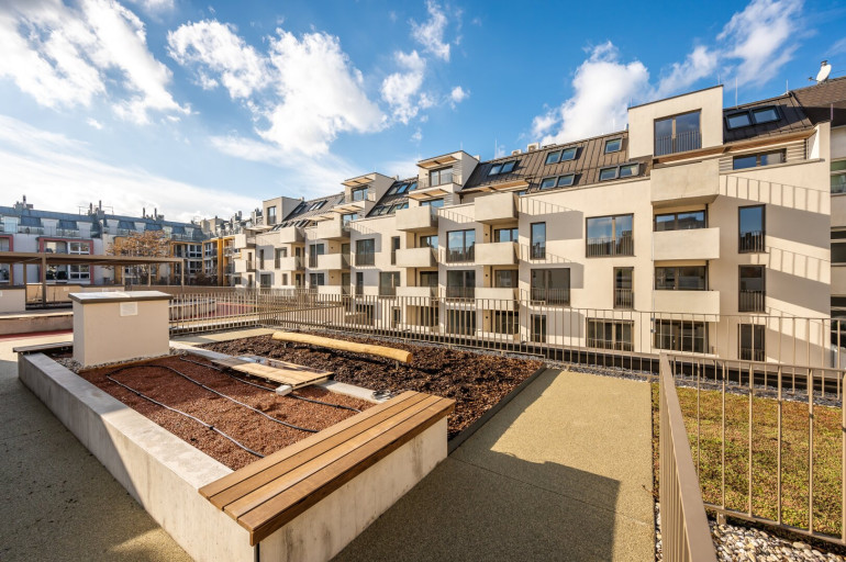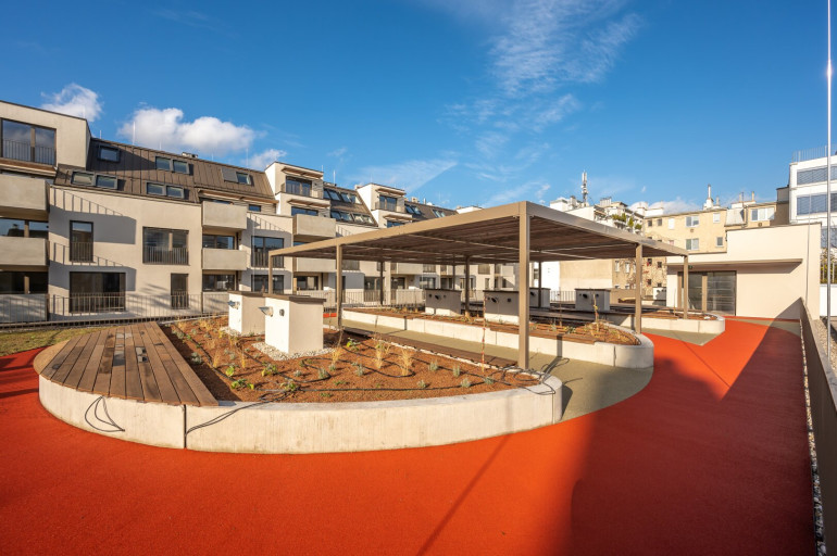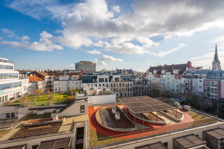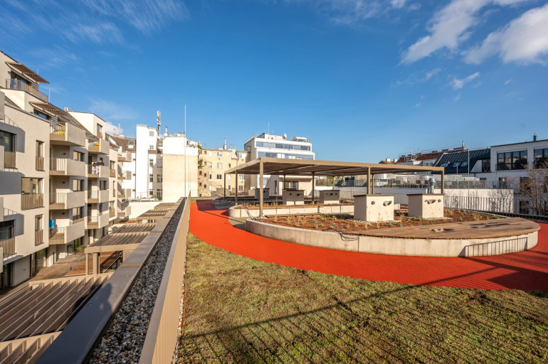 Das Haus selbst verfügt neben Waschküche, Fahrradabstellraum, großzügigen Fahrrardstehern im Freien, Kinderwagenraum, Postboxen und nachhaltigen Grünanlagengestaltungkonzept auch über eine eigene Laufbahn/Gemeinschaftsterrasse am Dach des Hofgebäudes. Darüber hinaus stehen in der hauseigenen Tiefgarage PKW als auch Motorradstellplätze zur Verfügung (gegen Aufpreis).