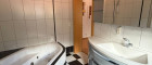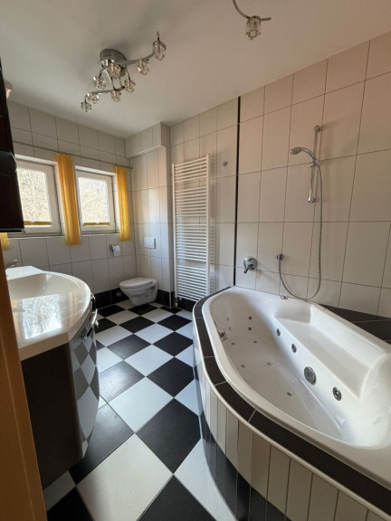 Badezimmer 1: Nach Norden ausgerichtet, ausgestattet mit einer Whirlpooleckbadewanne, einem WC und einem Fenster, das für natürliches Licht sorgt.