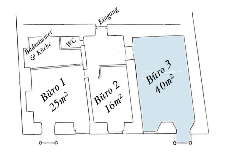 Im Objekt befinden sich drei Büroräume, welchen die Küche und das WC sowie der Empfangsbereich zur gemeinsamen Nutzung zur Verfügung steht. Ein Badezimmer ist ebenso vorhanden. Auch diese Kosten sind bereits im Mietpreis inkludiert.