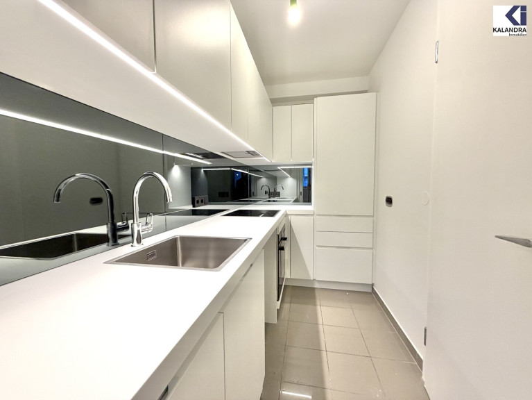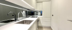 - Einbauküche mit weißen Fronten und Einbaugeräten,