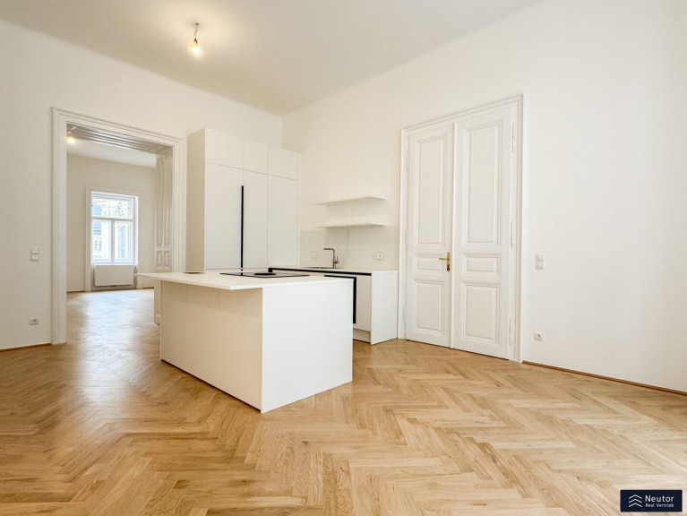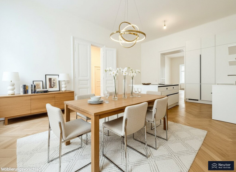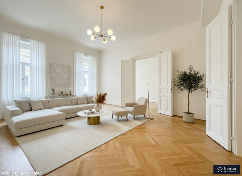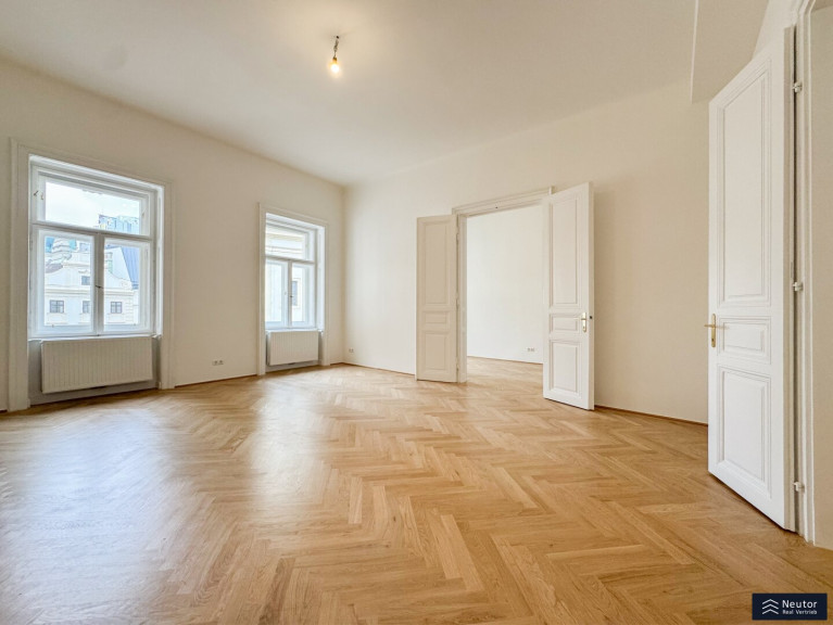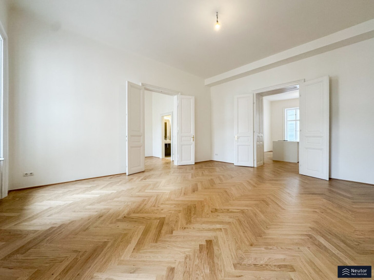 Hochwertiger Fischgrätparkett, lichtdurchflutete Räume und die hohen Decken ziehen sich wie ein roter Faden durch die gesamte Wohnung und verleihen ihr einen klassischen, zugleich zeitlos luxuriösen Charakter. Dieses exklusive Zuhause vereint Eleganz, Komfort und Wiener Lebensart auf perfekte Weise und bietet anspruchsvollen Bewohnern ein urbanes Wohngefühl der Extraklasse.