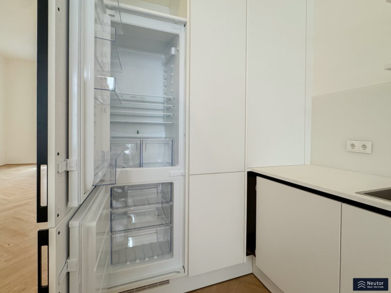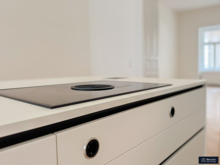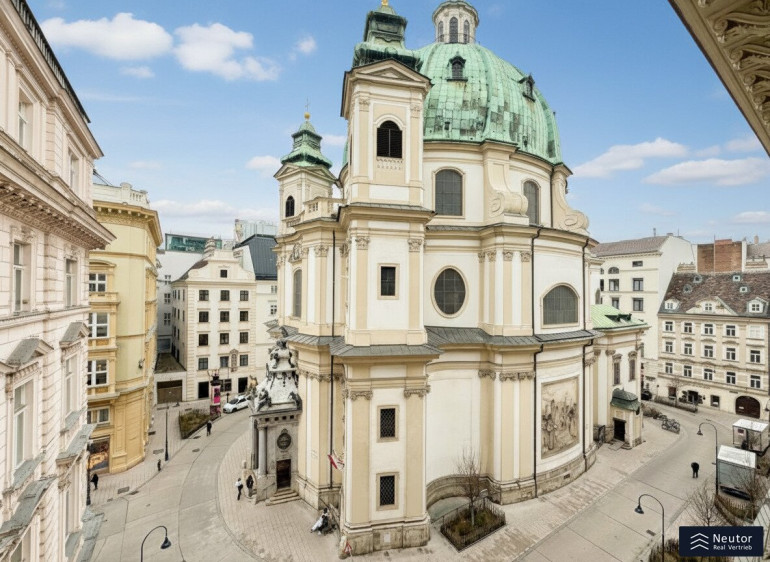 Der großzügige Vorraum eröffnet ein einladendes Entree und führt zu den klar strukturierten Räumen dieser außergewöhnlichen Wohnung. Die moderne Wohnküche mit hochwertigen Einbaugeräten lädt zum Kochen, Genießen und geselligen Zusammensein ein und wird so zum stilvollen Herzstück der Wohnung. Das angrenzende Wohn- und Esszimmer beeindruckt mit seiner Großzügigkeit, den hohen Decken und edlen Doppelflügeltüren und schafft eine offene, einladende Atmosphäre. Von hier bietet sich ein direkter Blick auf die Peterskirche, der den besonderen Charme und das exklusive Flair dieser Lage auf eindrucksvolle Weise unterstreicht.