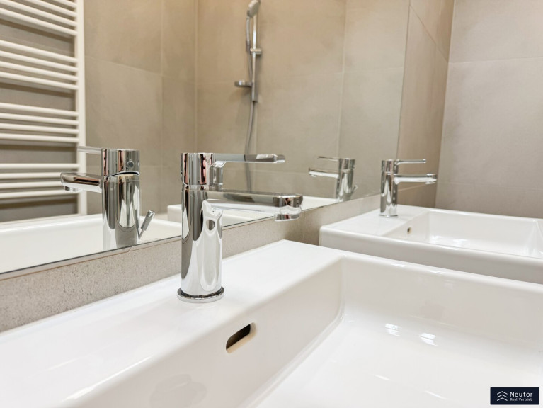 Vom Wohnbereich aus gelangt man in eines der fünf Zimmer, das über ein angrenzendes Badezimmer mit Dusche verfügt. Dieses Durchgangsbadezimmer erschließt zudem ein weiteres Zimmer und verbindet Funktionalität mit einer eleganten Raumgestaltung. Auf der gegenüberliegenden Seite des Gangs befindet sich ein weiteres großzügiges Zimmer, ergänzt durch einen weiten Abstellraum mit Fenster, der sich ideal als begehbare Garderobe oder exklusives Ankleidezimmer nutzen lässt. Ein zusätzliches luxuriöses Badezimmer mit Badewanne, Doppelhandwaschbecken und WC beeindruckt durch seine hochwertige Ausstattung und das elegante Spa-Ambiente.