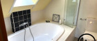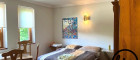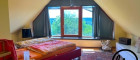 - Repräsentatives Master-Bedroom im OG mit atemberaubendem Blick über die Hügellandschaft der Südoststeiermark – direkt angeschlossen ein großzüges Ankleidezimmer und auch das Badezimmer mit Wanne – Holzbalken sorgen für Wärme