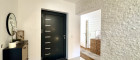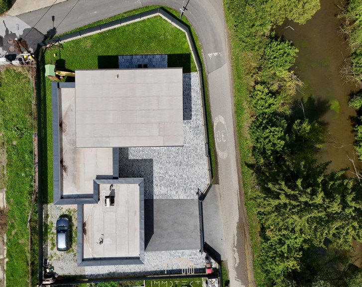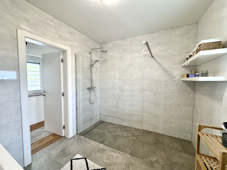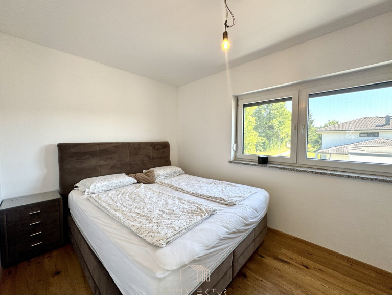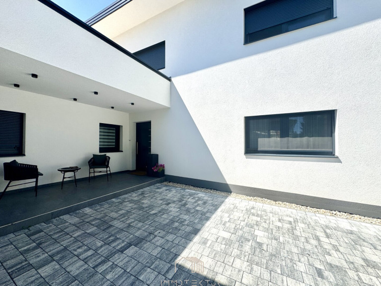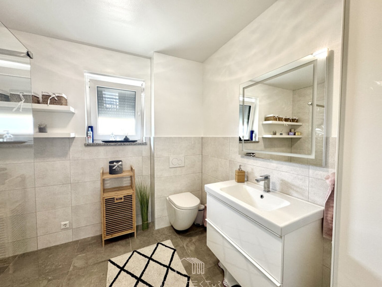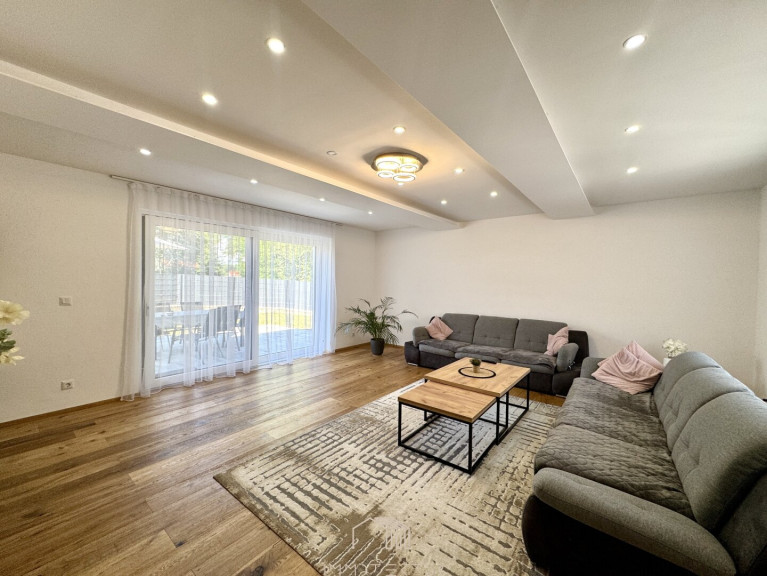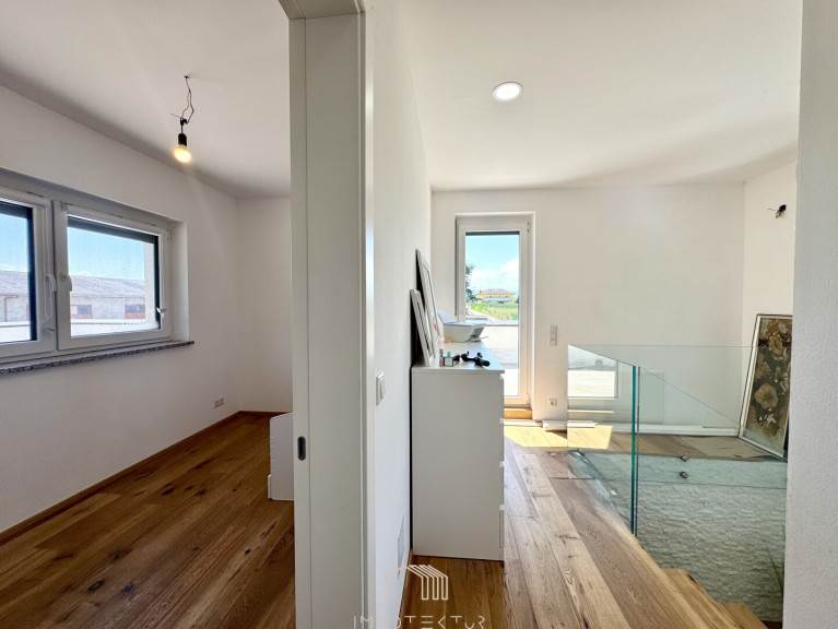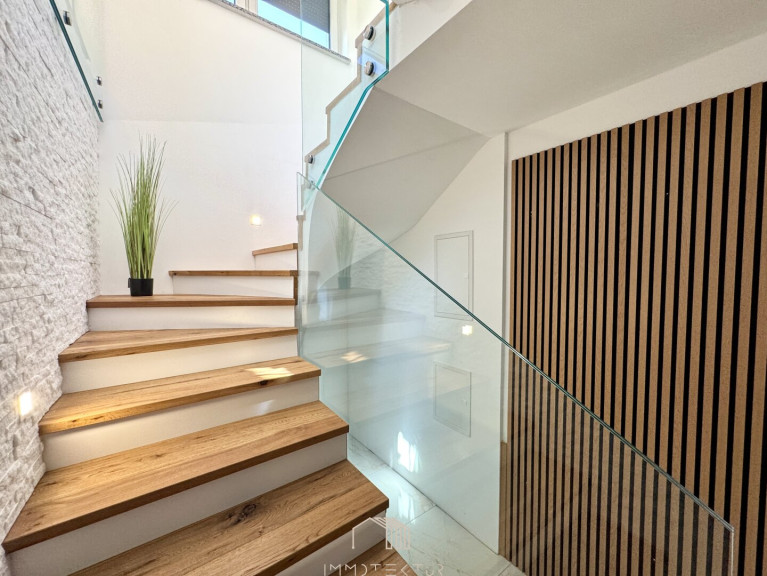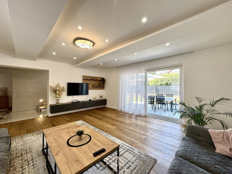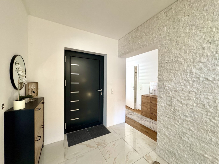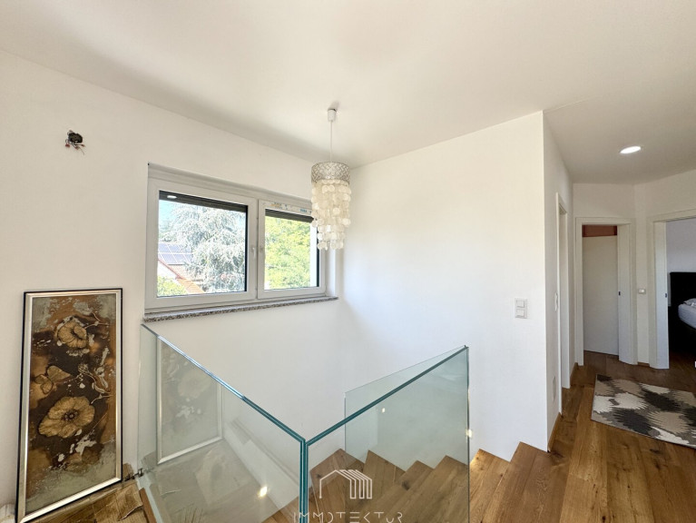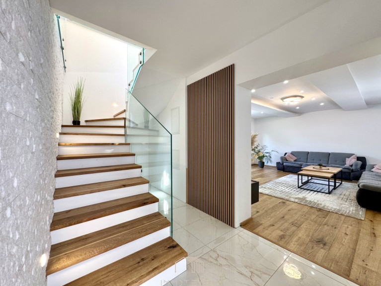 Das Haus erstreckt sich über zwei Ebenen mit einem familienfreundlichen Grundriss und viel Tageslicht. Im Erdgeschoss erwartet Sie ein großzügiges Wohnzimmer mit Terrassenzugang, eine hochwertige DAN-Küche mit Markengeräten, ein ruhiges Schlafzimmer sowie ein modernes Bad mit Dusche und WC. Edler Eichenparkett, große Fliesen und eine Natursteinwand sorgen für stilvolles Wohnambiente.
