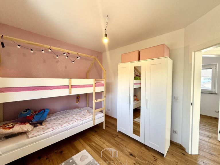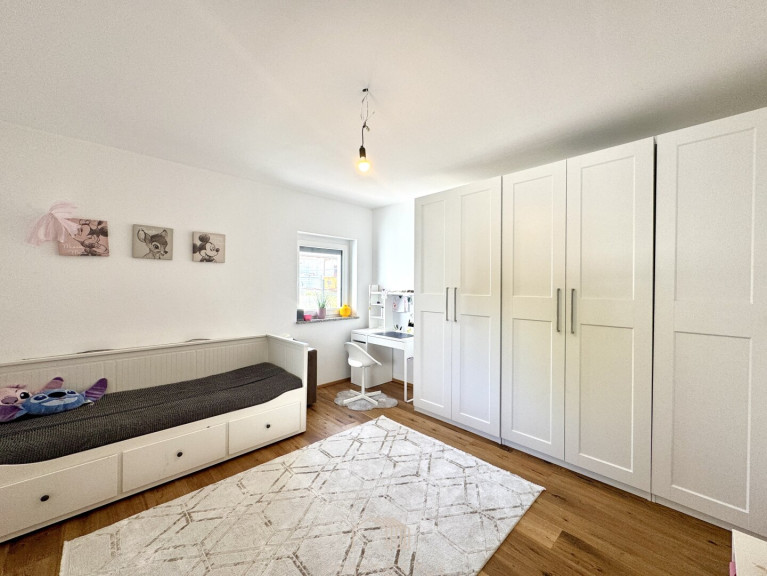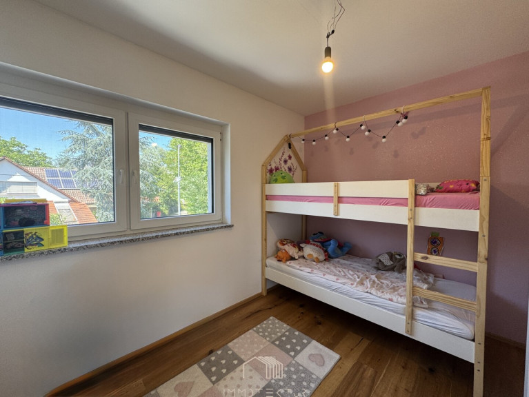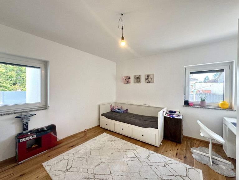 Im Obergeschoss befinden sich zwei helle Zimmer, ideal als Kinder- oder Arbeitszimmer, ein zusätzlicher Abstellraum (aktuell als kleines Kinderzimmer genutzt) sowie ein zweites Badezimmer mit Badewanne – ideal für Familien mit mehreren Kindern.