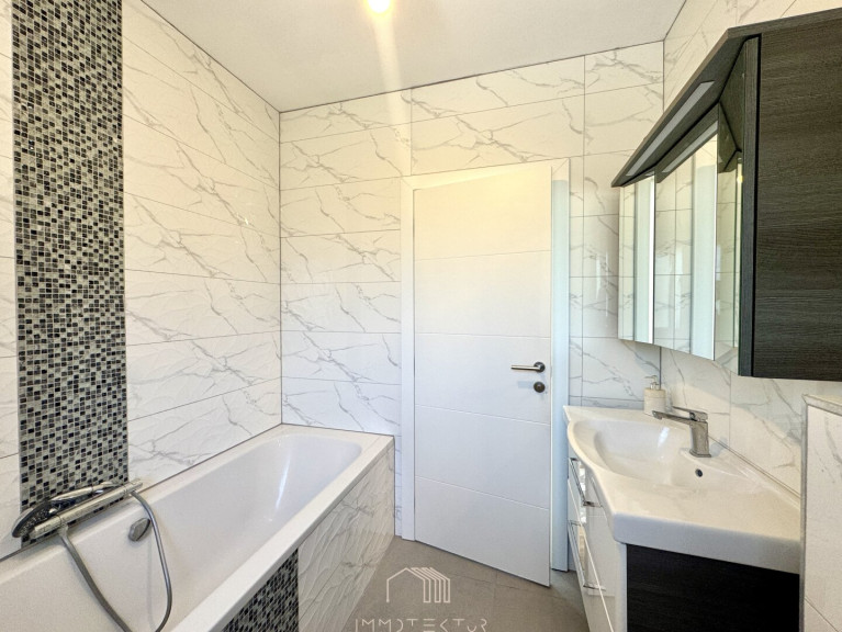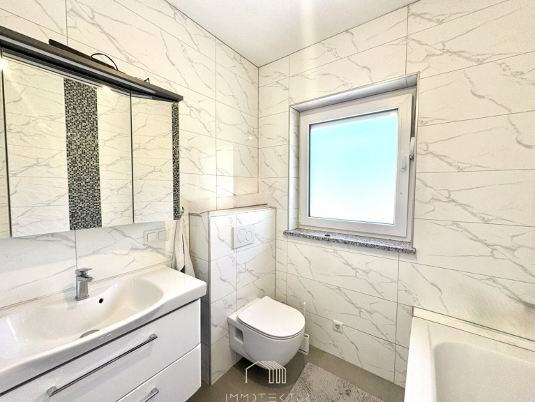 Fliesen, Parkett, Fußbodenheizung, Einbauküche, Bad mit Fenster, Badewanne, Dusche, Garage