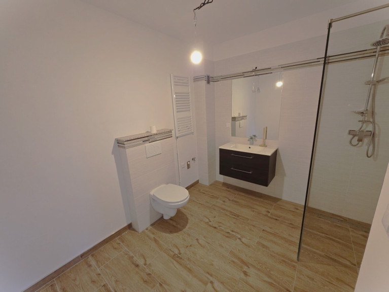 - Badezimmer/WC: 7,38m² (moderne Dusche, Handwaschbecken, verfliest, Toilette, Waschmaschinenanschluss und Platz für Trockner)