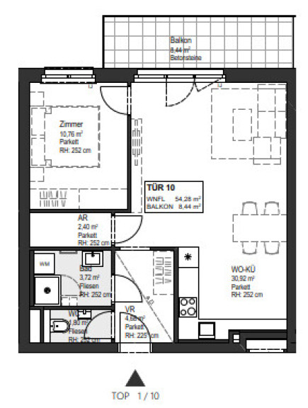 Fliesen, Parkett, Fußbodenheizung, Einbauküche, Westbalkon, Dusche
