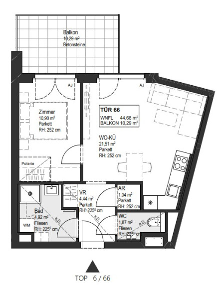 Fliesen, Parkett, Fußbodenheizung, Einbauküche, Westbalkon, Dusche