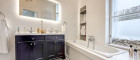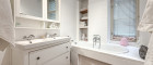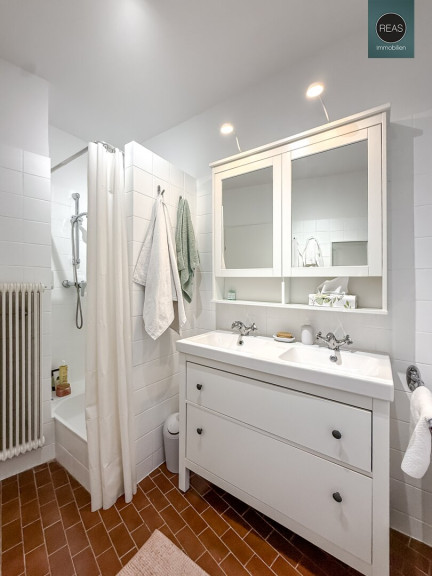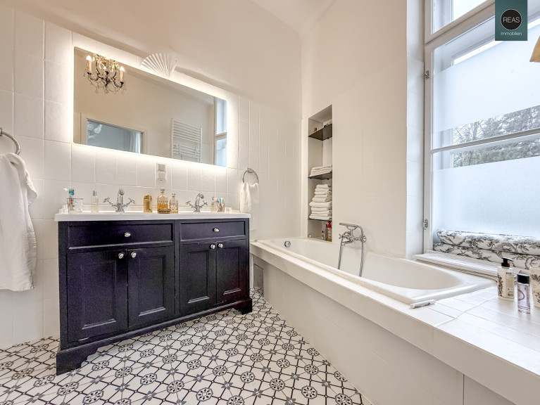- 1 Bad mit Badewanne, Doppelwaschbecken, Dusche sowie einem Fenster