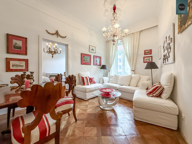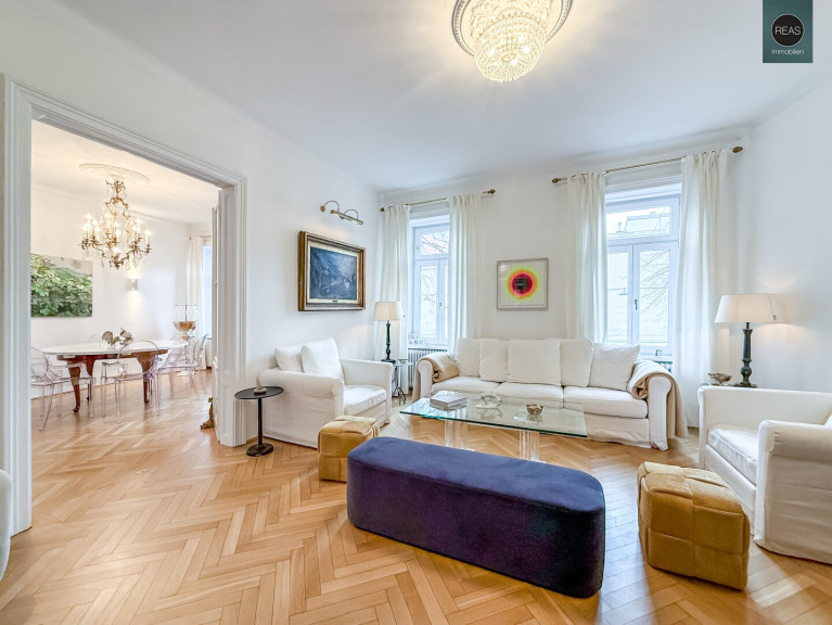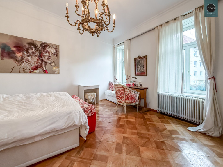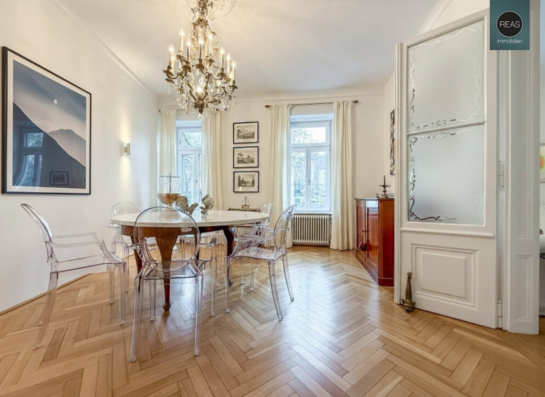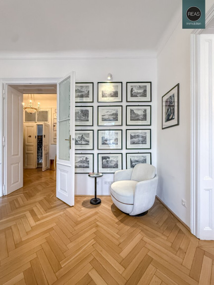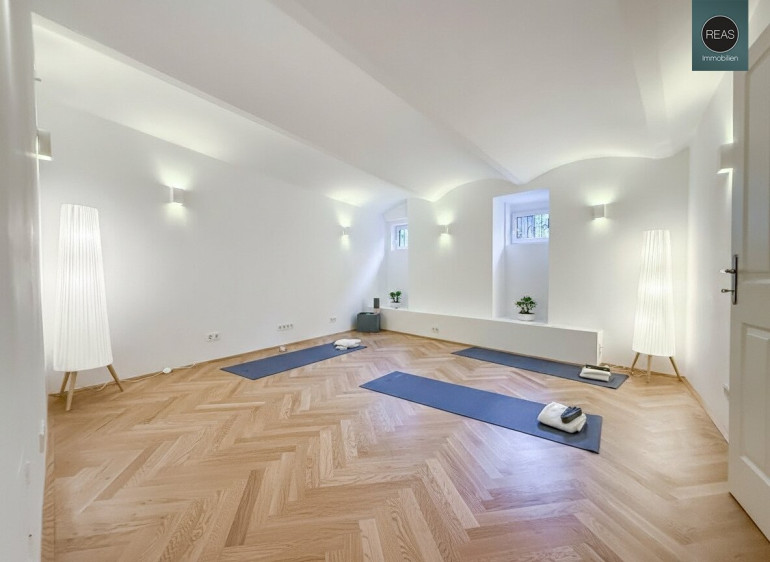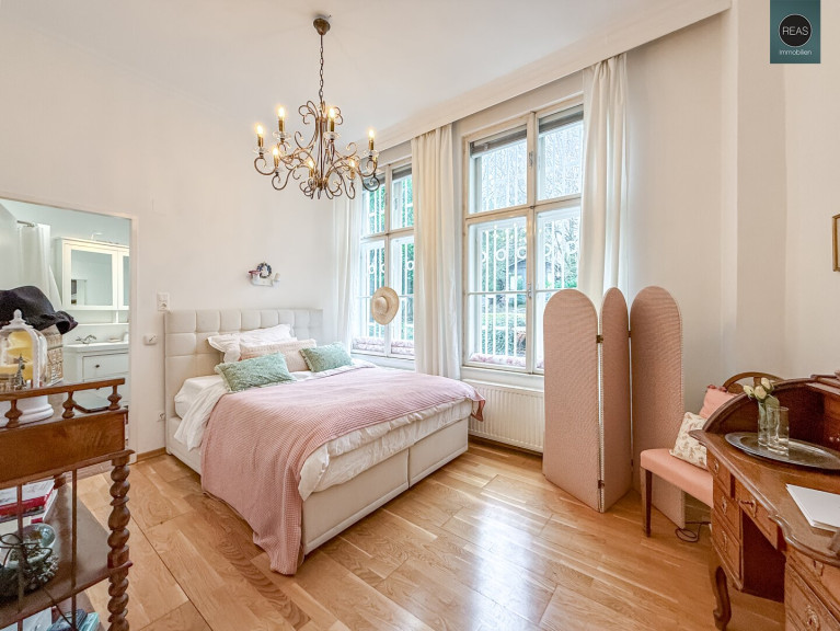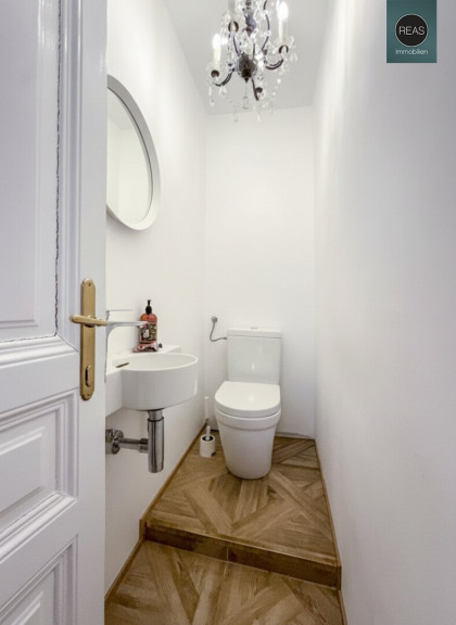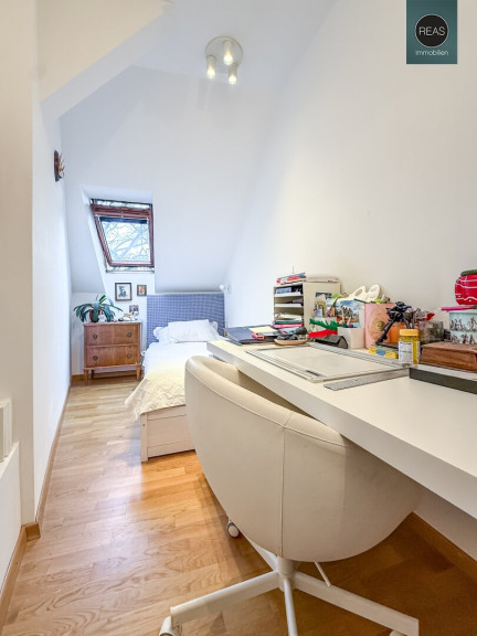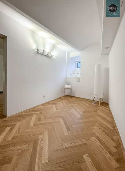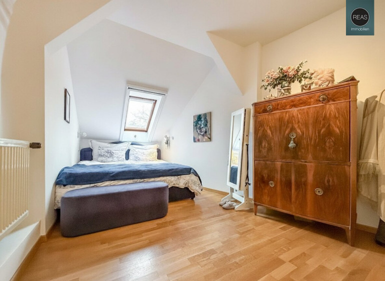 Im ersten Stock und im Dachgeschoß erstreckt sich eine großzügige Wohnung über zwei Ebenen, verbunden sowohl über das Stiegenhaus als auch über eine interne Treppe.