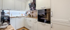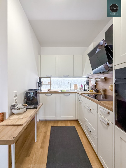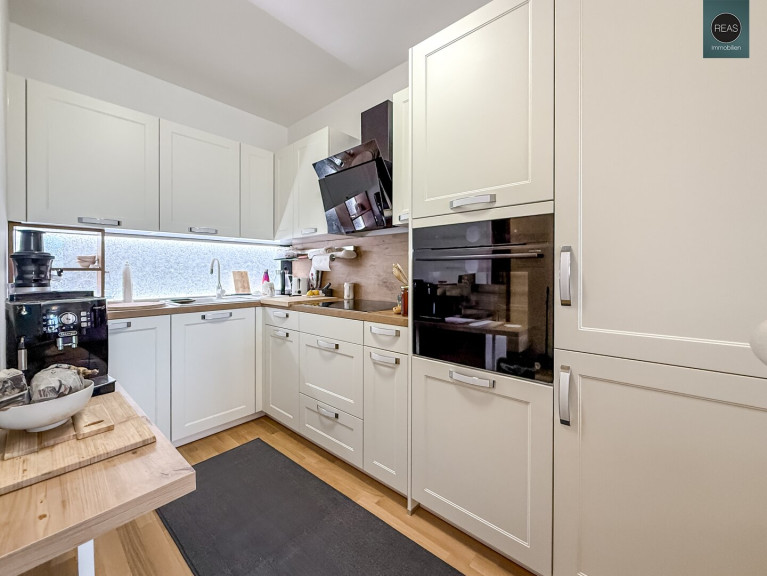 - 1 Küche mit hochwertiger Einbauküche inkl. aller Geräte (Kühl-Gefrierkombi, E-Herd, E-Backofen, Dunstabzug, Geschirrspüler, Spüle) sowie einem Essbereich samt Tisch