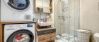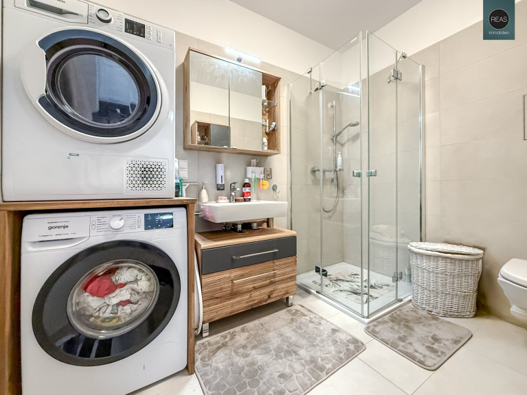 - 1 BAD/WC mit Dusche samt Glaswand, WC, Waschbecken, Handtuchheizkörper sowie einem Waschmaschinenanschluss