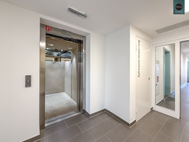 Parkett, Fliesen, Fußbodenheizung, Einbauküche, Personenaufzug, Ostbalkon, Dusche