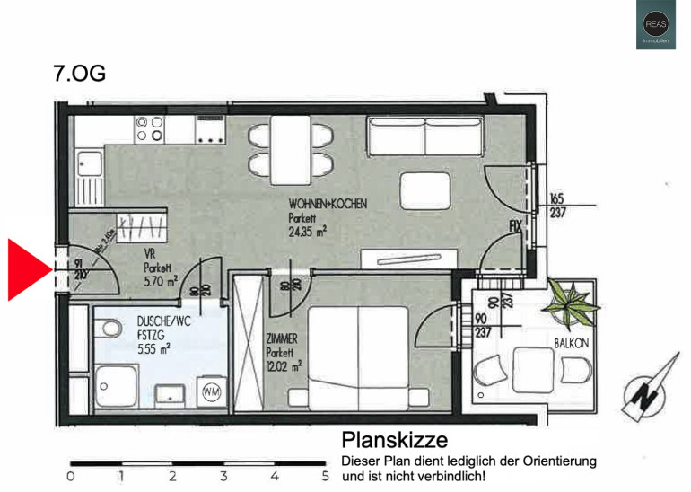 Das neuwertige Apartment befindet sich im 7. Stock (mit Lift) und besteht aus: