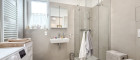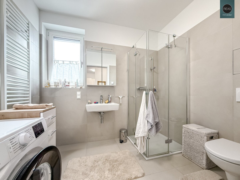 - 1 BAD/WC mit Dusche samt Glaswand, WC, Waschbecken, Handtuchheizkörper, Waschmaschinenanschluss sowie einem Fenster