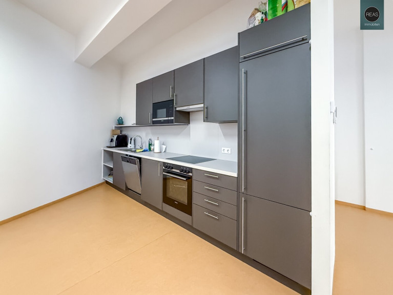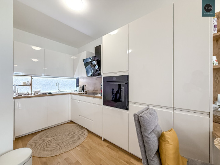 - 1 Küche mit hochwertiger Einbauküche inkl. aller Geräte (Kühl-Gefrierkombi, E-Herd, E-Backofen, Dunstabzug, Geschirrspüler, Spüle) sowie einem Essbereich samt Tisch