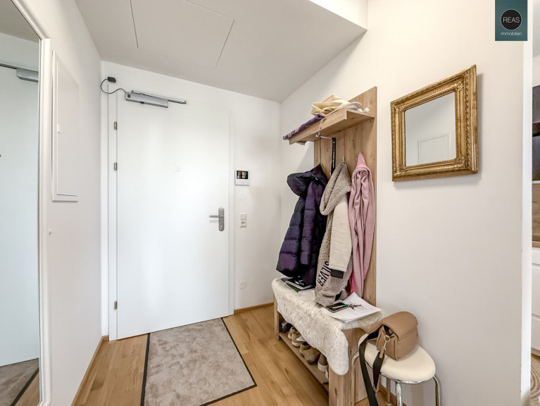 Zur hochwertigen Ausstattung der Wohnung gehören unter anderem: WK3 Sicherheits-Eingangstüre mit Alarmanlagenvorbereitung, Deckenkühlung mittels Fernkälte, Fußbodenheizung mittels Fernwärme, Echtholzparkettböden, Feinsteinzeug im Badezimmer, 3-Fach verglaste Thermo-Fenster (Holz-Alu) inkl. Außenbeschattungen (elektrische Screens), Balkon mit Panorama-Blick samt Blumentrog und Beleuchtung, trockenes und großzügiges Kellerabteil, Video-Gegensprechanlage, uvm.