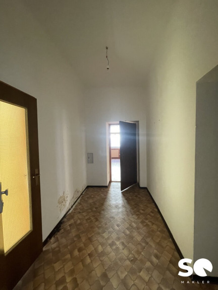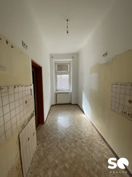 Ausgestattet ist das Objekt mit einem Holzparkettboden, Fliesen in den Nassräumen sowie einer Einbauküche. Die Beheizung und Warmwasserversorgung erfolgen über eine effiziente Gastherme. Die Wohnung befindet sich in einem sanierungsbedürftigen Zustand.