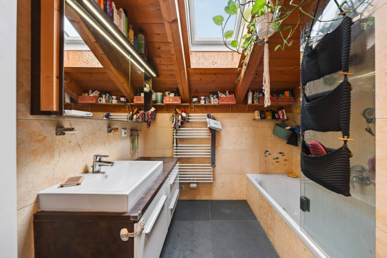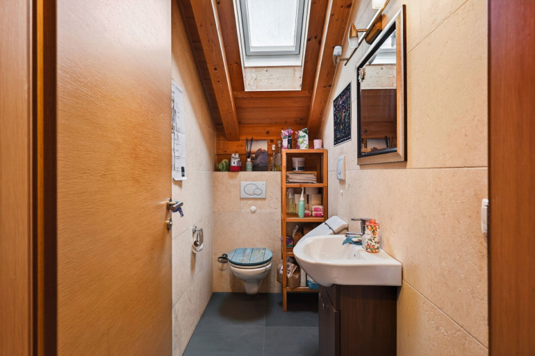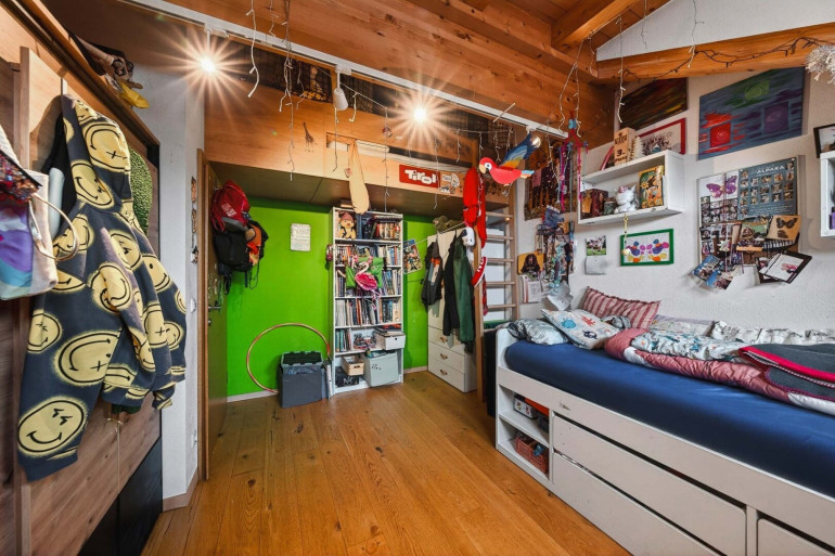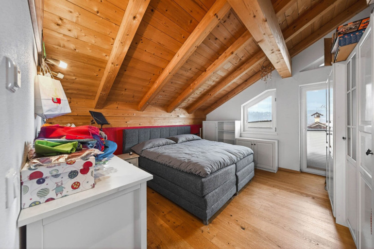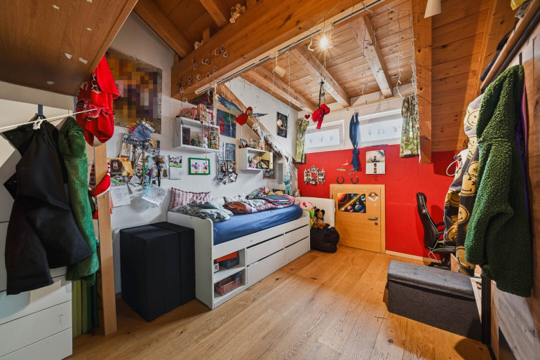 Weiters verfügt die Wohnung über ein Schlafzimmer mit Zugang zum Balkon sowie ein weiteres Zimmer, das derzeit als Kinderzimmer genutzt wird. Dieses bietet aufgrund der Raumhöhe eine praktische Schlafgalerie sowie einen zusätzlichen Dachraum, der ideal als Stauraum genutzt werden kann.