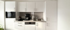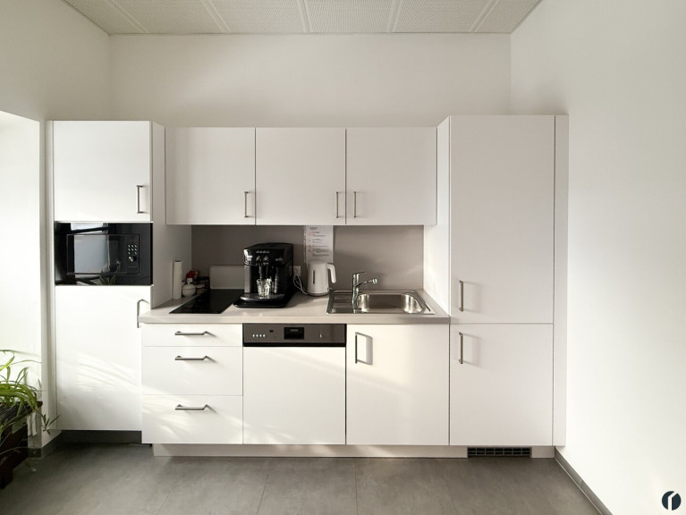 Die Teeküche präsentiert sich modern und ist funktional ausgestattet mit 2-Platten-Kochfeld, Mikrowelle, Geschirrspüler, Spülbecken und einer Kühl-Gefrierkombination.