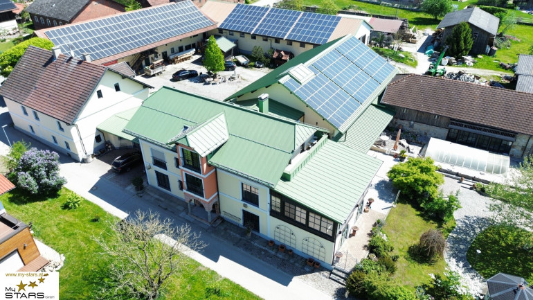 Auf den Dächern der verschiedenen Gebäude sind PV-Anlagen mit einer Gesamt-Leistung von ca. 86 kWp installiert. Die Einnahmen betragen derzeit ca. 1700 € im Monat.