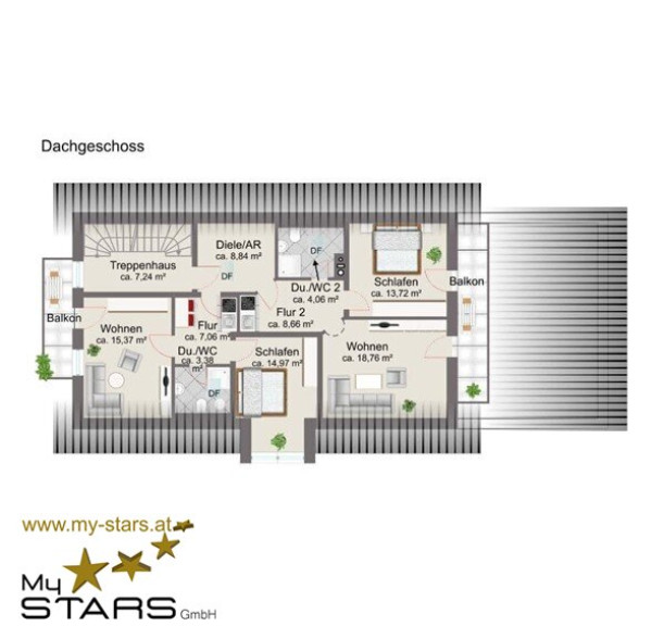 - im Dachgeschoss sind 2 Appartements für Gäste, Freunde, Mitarbeiter… Beide Appartements sind ausgestattet mit Schlafzimmer, Wohnzimmer mit Balkon, Duschbad, sowie eine kleine Küchenzeile.