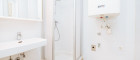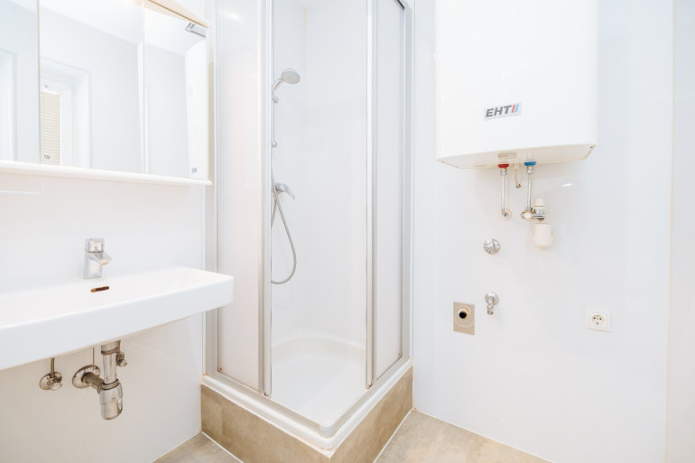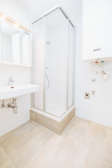 Das Badezimmer ist modern gestaltet, mit Dusche und Fenster, das für Tageslicht und frische Luft sorgt. Die separate Toilette bietet zusätzlichen Komfort.