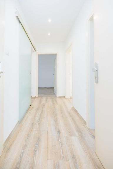 Beim Betreten der Wohnung empfängt Sie ein großzügiger Vorraum, der mit hochwertigen Einbauspots stimmungsvoll beleuchtet wird. Hier finden Sie ausreichend Platz für eine Garderobe und Stauraum. Alle Zimmer sind separat begehbar, was die Wohnung besonders praktisch für Familien oder Wohngemeinschaften macht.