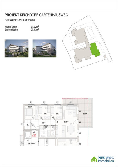 Die Immobilie befindet sich am Gartenhausweg in 4560 Kirchdorf an der Krems, einer Stadt in Oberösterreich. Sie liegt in einer ruhigen Gegend, in bester Zentrumslage in einer Sackgasse. Die 18 Wohneinheiten werden, im für die Fa. Neuwog üblichen, gehobenen Standard errichtet. NEUWOG steht für herzliche Betreuung und zufriedene Kunden!